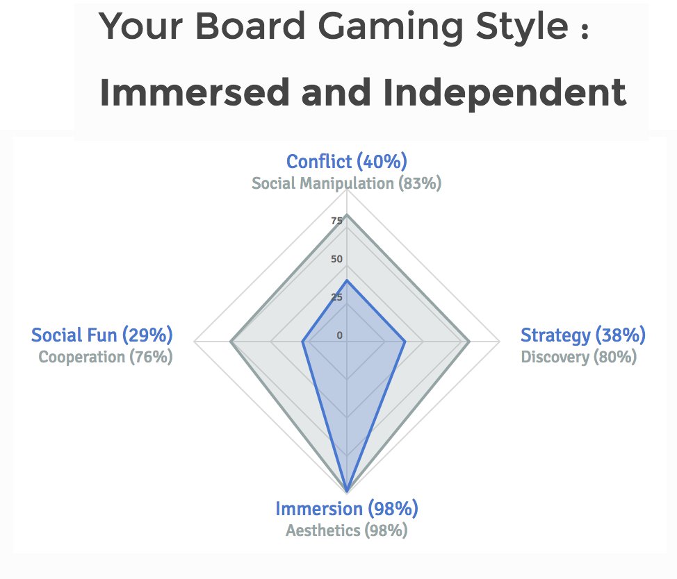 Ya había oído hablar de él, pero el otro día me dispuse a realizar el test para crear mi perfil de motivación e interés en los juegos de mesa. A todos los que les guste jugar e introducir procesos de juego en sus dinámicas o proyectos, les recomiento mucho que, por lo menos, lo completen una vez (y ya si consiguen que más gente lo realice para sacar conclusiones, pues mejor que mejor…)